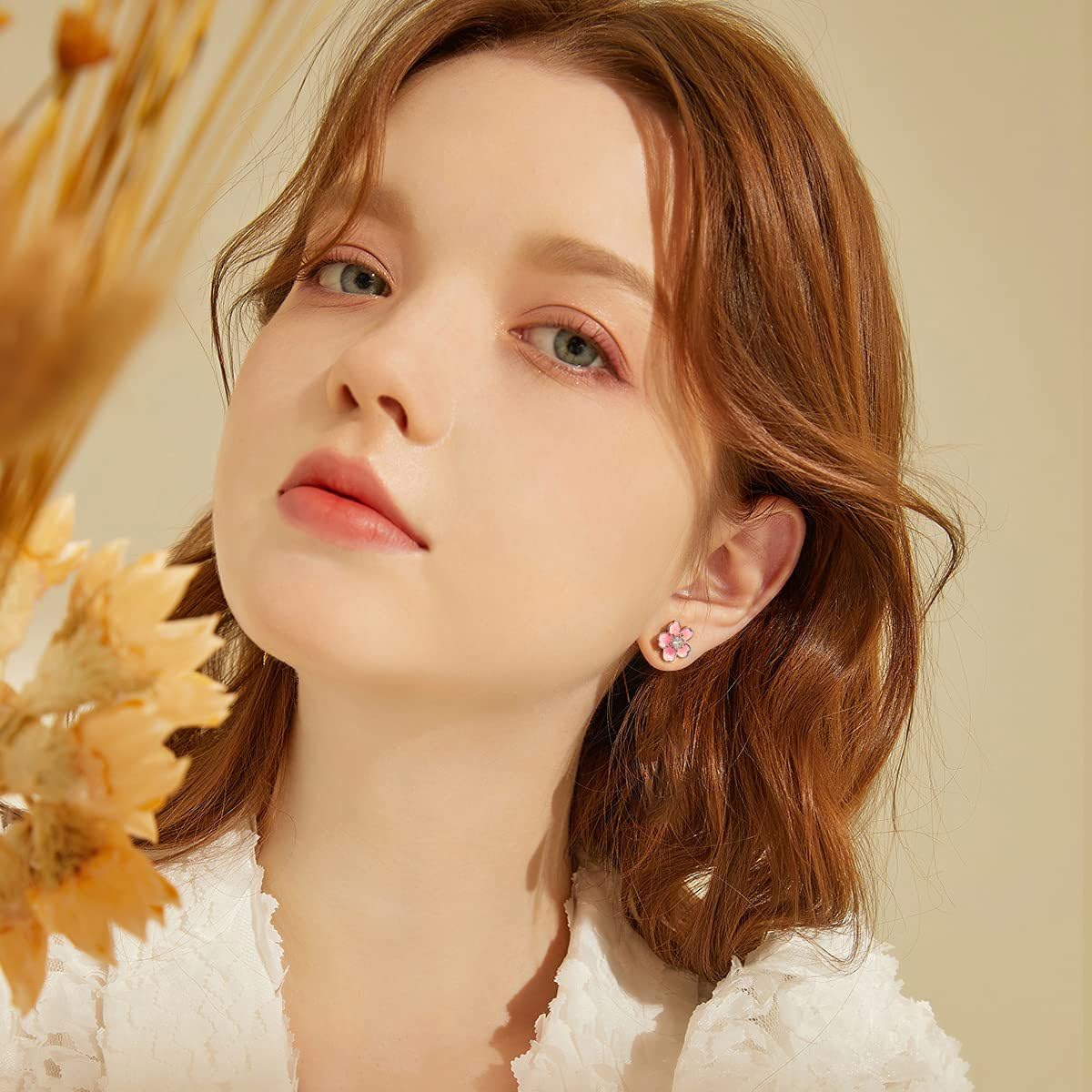 HONGRUI 925 Sterling Silver Pink Cherry Blossom Stud Earrings for Teenage Sakura Flower Hypoallergenic Flatback Earrings For Women Jewelry Gifts