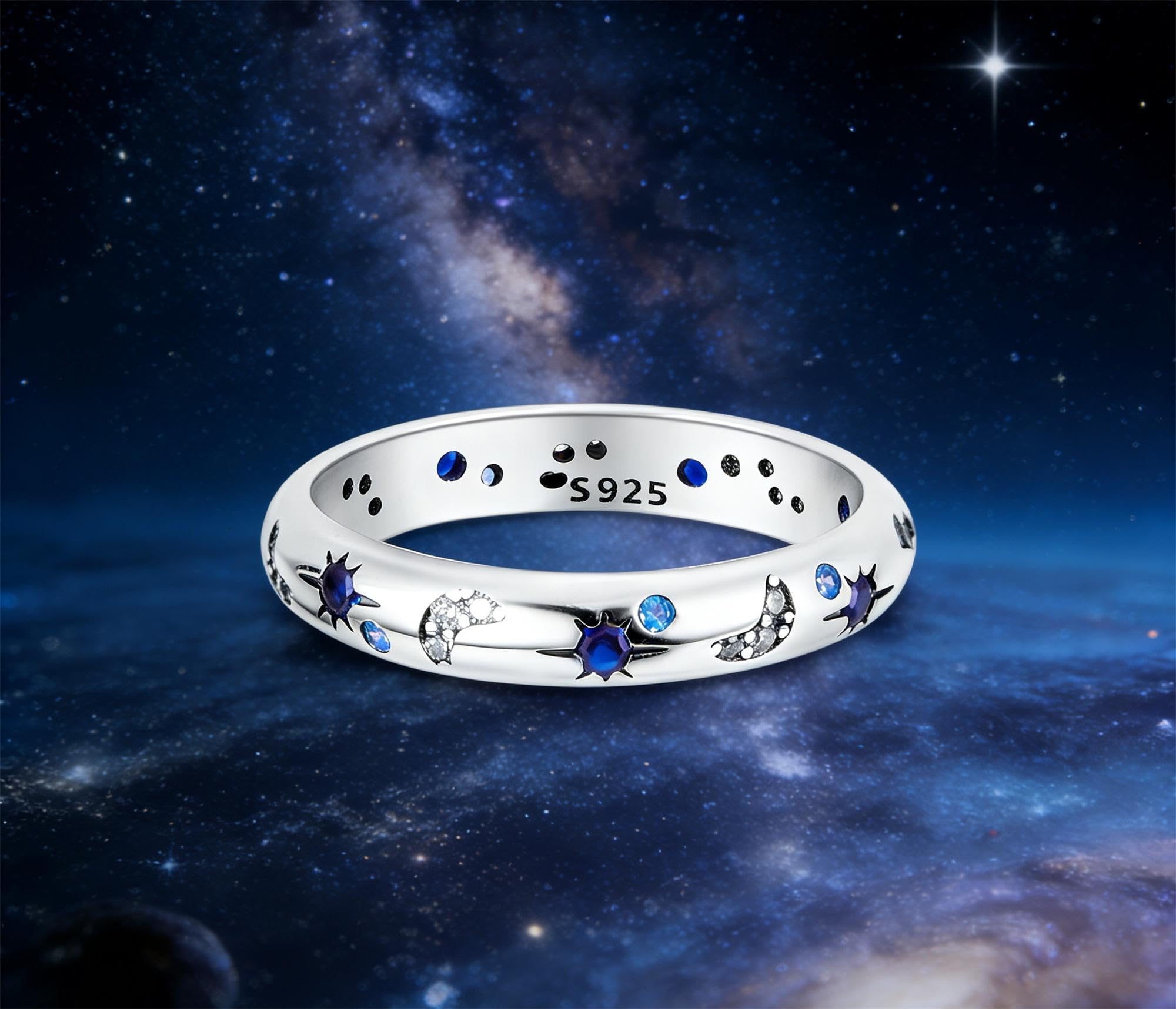 - STUNNING DESIGN: Features an enchanting pattern of Sun moons and stars adorned with clear and blue cubic zirconia stones that sparkle beautifully, creating a dreamy celestial aesthetic rings.